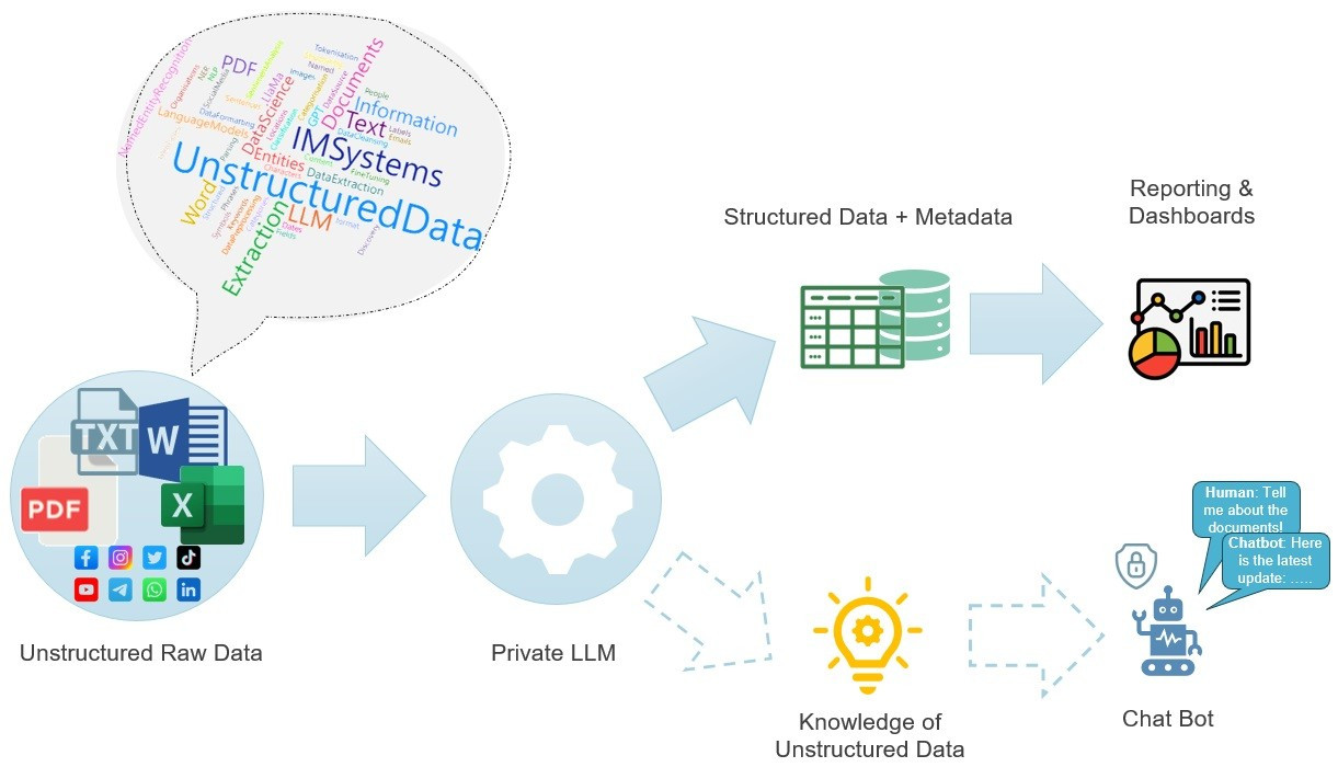 In IM Systems, we have developed a solution to convert unstructured data into structured information using a step-by-step process generating concise data sets out of unstructured data. We begin with identifying the data sources and utilise Transformer neural networks to encode unstructured data into vectorised information. Then by embedding these vectors into a private large language model, we can analyse and comprehend the unstructured data. We then provide a decoding instruction to the LLM model to provide a form of structured data which is easily reformable into any standard structure. This structured data is then systematically validated for accuracy, populated and integrated into various systems and databases while maintaining continuous updates to reflect changes in the source data. This can be a fully automated process, or may include manual verification checkpoints.