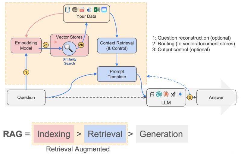 In this diagram, the traditional generation path for LLMs (similar to directly querying models like ChatGPT) is separated from the enhanced RAG (Retrieval Augmented Generation) pathway. This simplification shows how RAG systems integrate context-specific data (your data, which the model hasn’t seen during training) through targeted prompt engineering to enrich the prompt with the desired context.